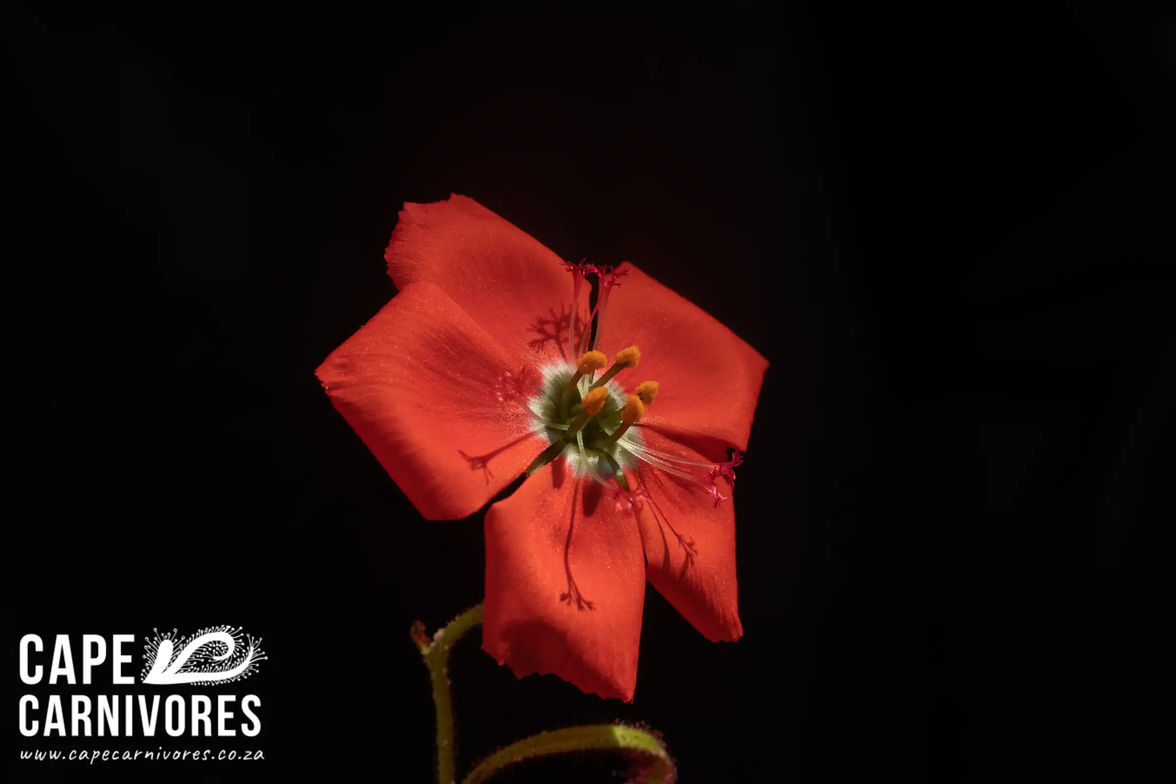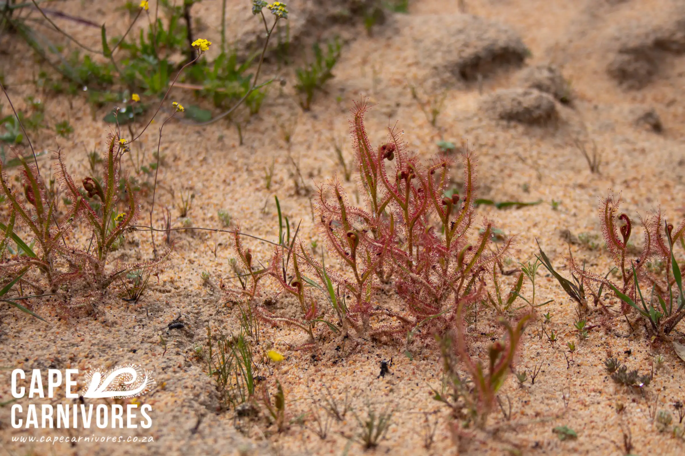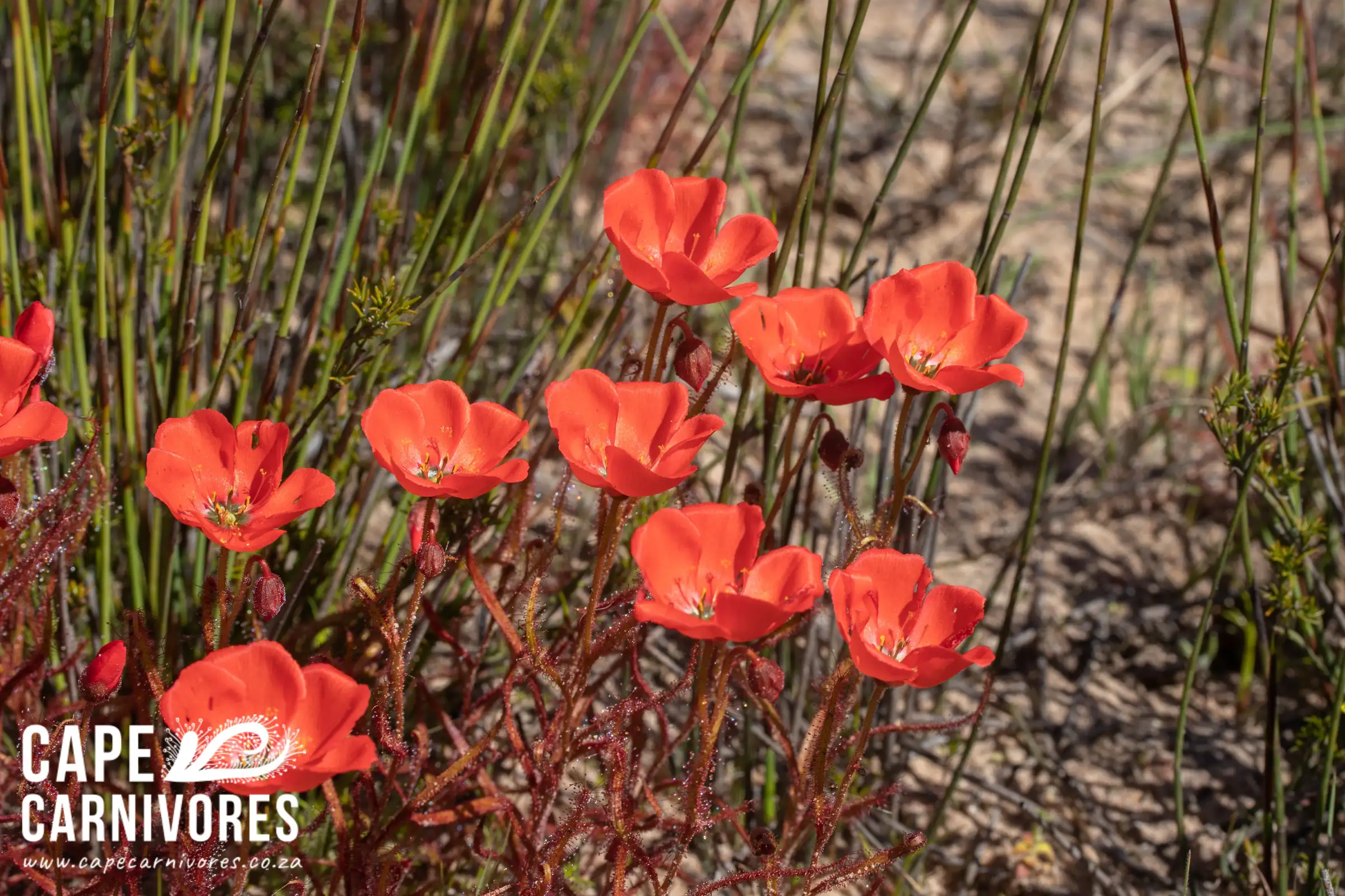 A beautiful form of Drosera cistiflora, the red-flowered plants occur in the flatter Swartland regions, especially on sandy Strandveld and parts of the fynbos near Darling where a well-known spot exists, but is threatened at that locale by feral pigs damaging the habitat.