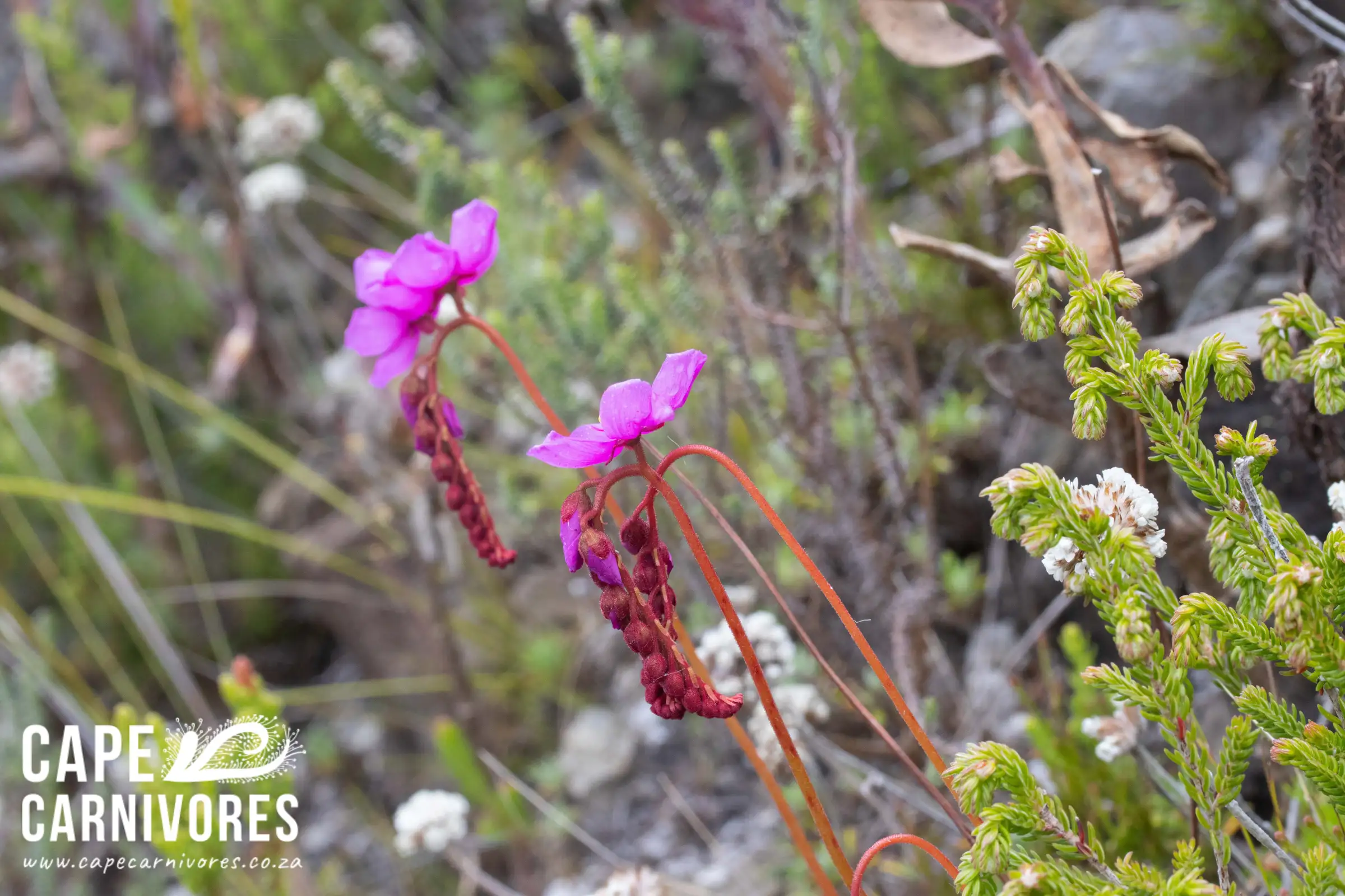 These sundews are primarily montane and grow on gentle slopes in dry, well-draining sandy soils, especially in areas receiving frequent coastal fog that moisten the soil without waterlogging. Flowering occurs in Summer producing several large, purply flowers. In harsh summers the plants can die back and regrow from buds or roots. It is named after Elsie Esterhuysen, a well-known South African botanist.