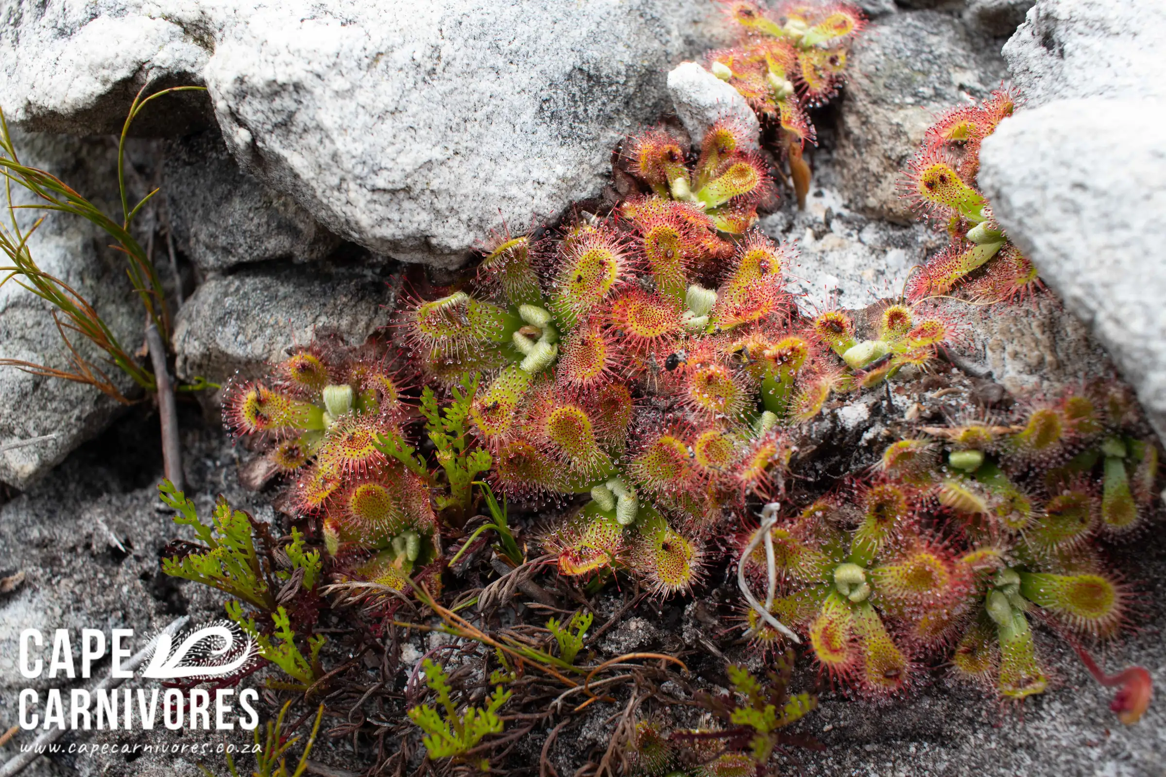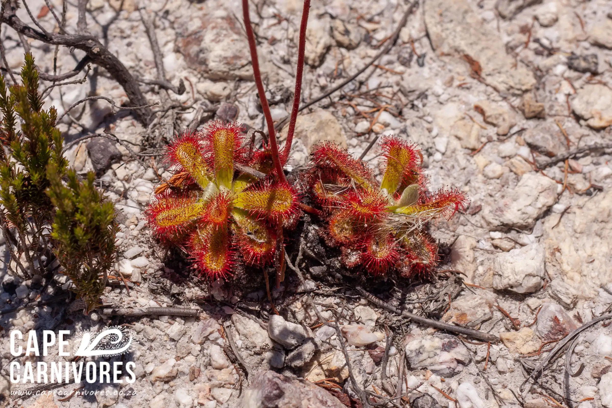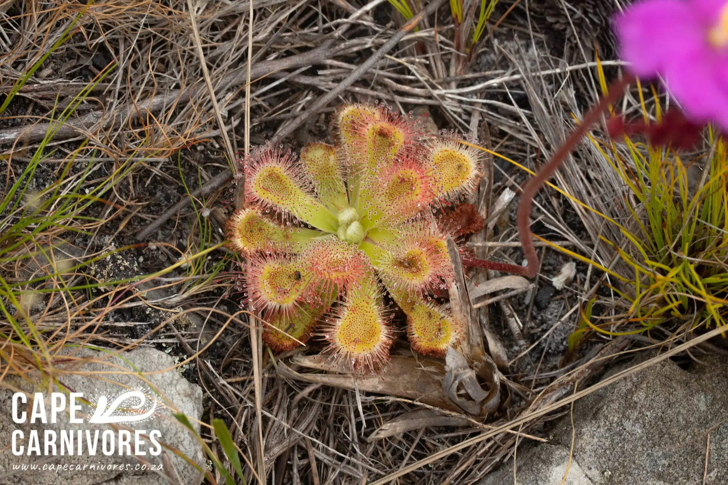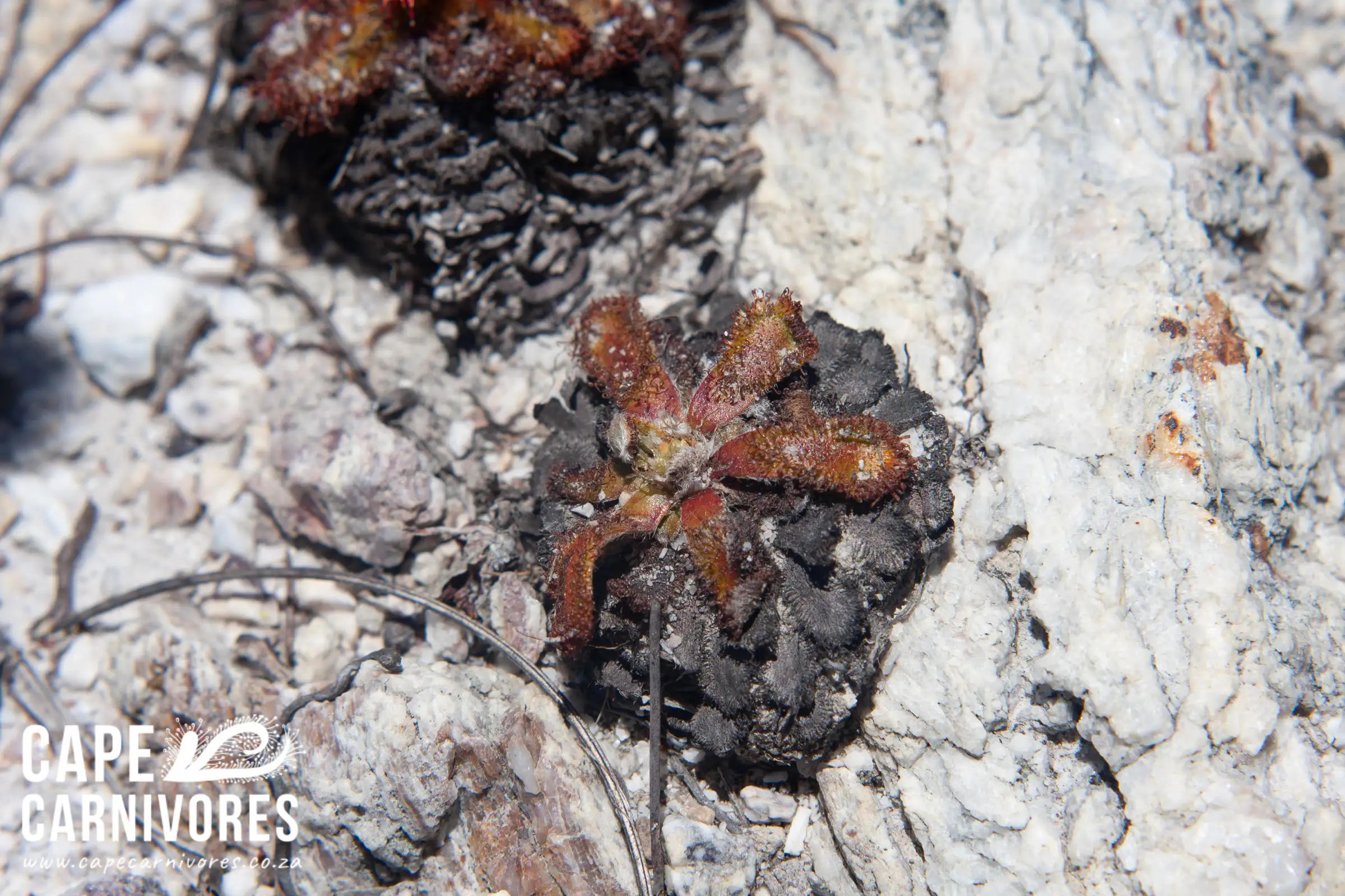 Drosera esterhuyseniae is an unusual rosetted sundew from the coastal mountains of the Cape. A longer-leaf form is found South of Grabouw through the coastal mountains to Bredasdorp, and the more compact form is found in the area from Grabouw through to the mountains SE of Stellenbosch. This species is notable for its strong semi-erect leaves and golden-green colouration with broad petioles and densely hairy abaxial surfaces similar to most of the xeric species. The northern form has flatter, shorter leaves.