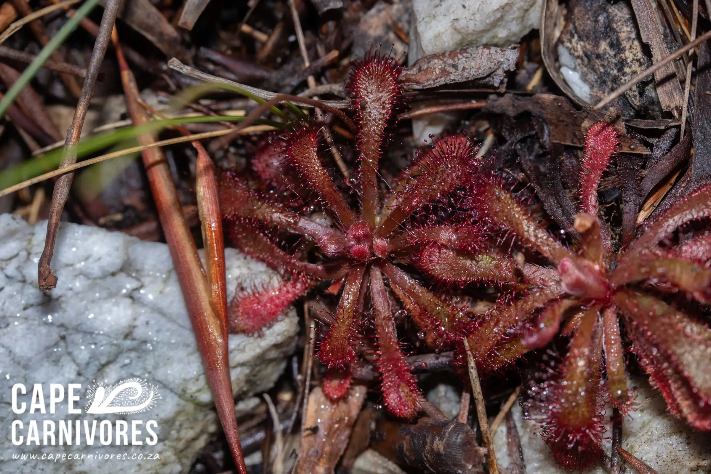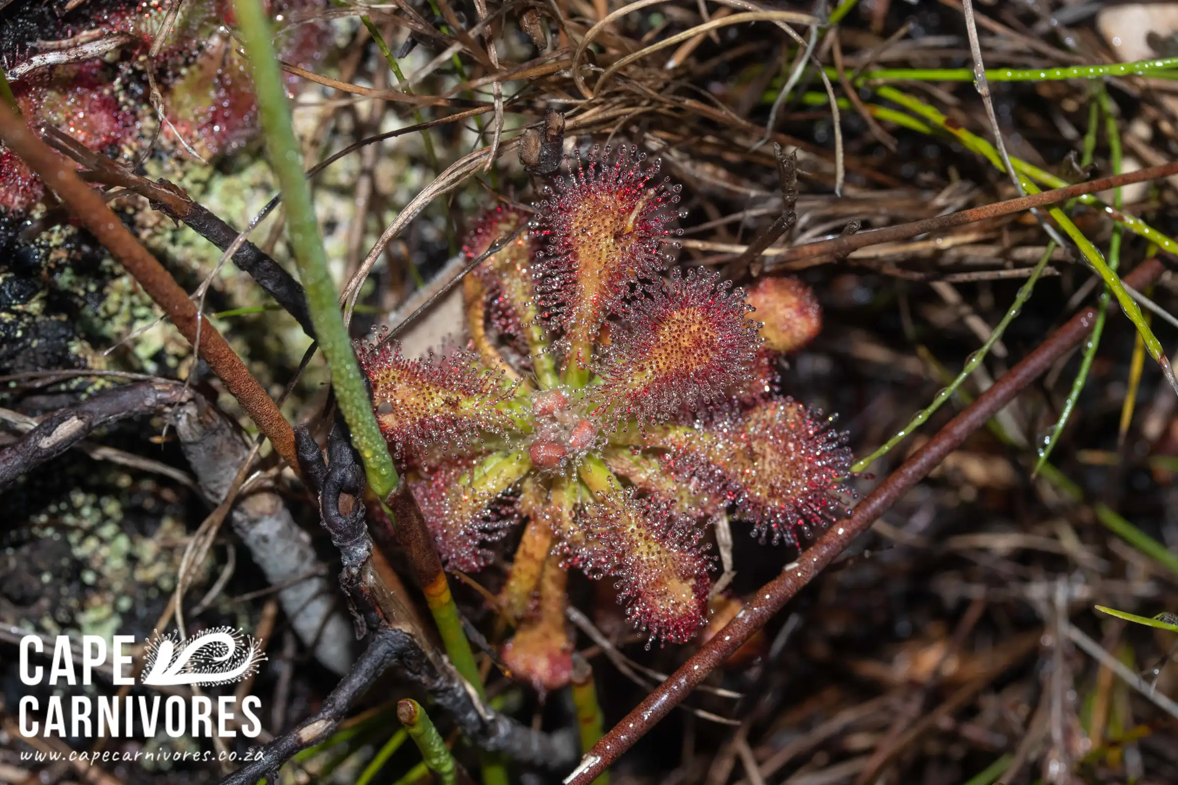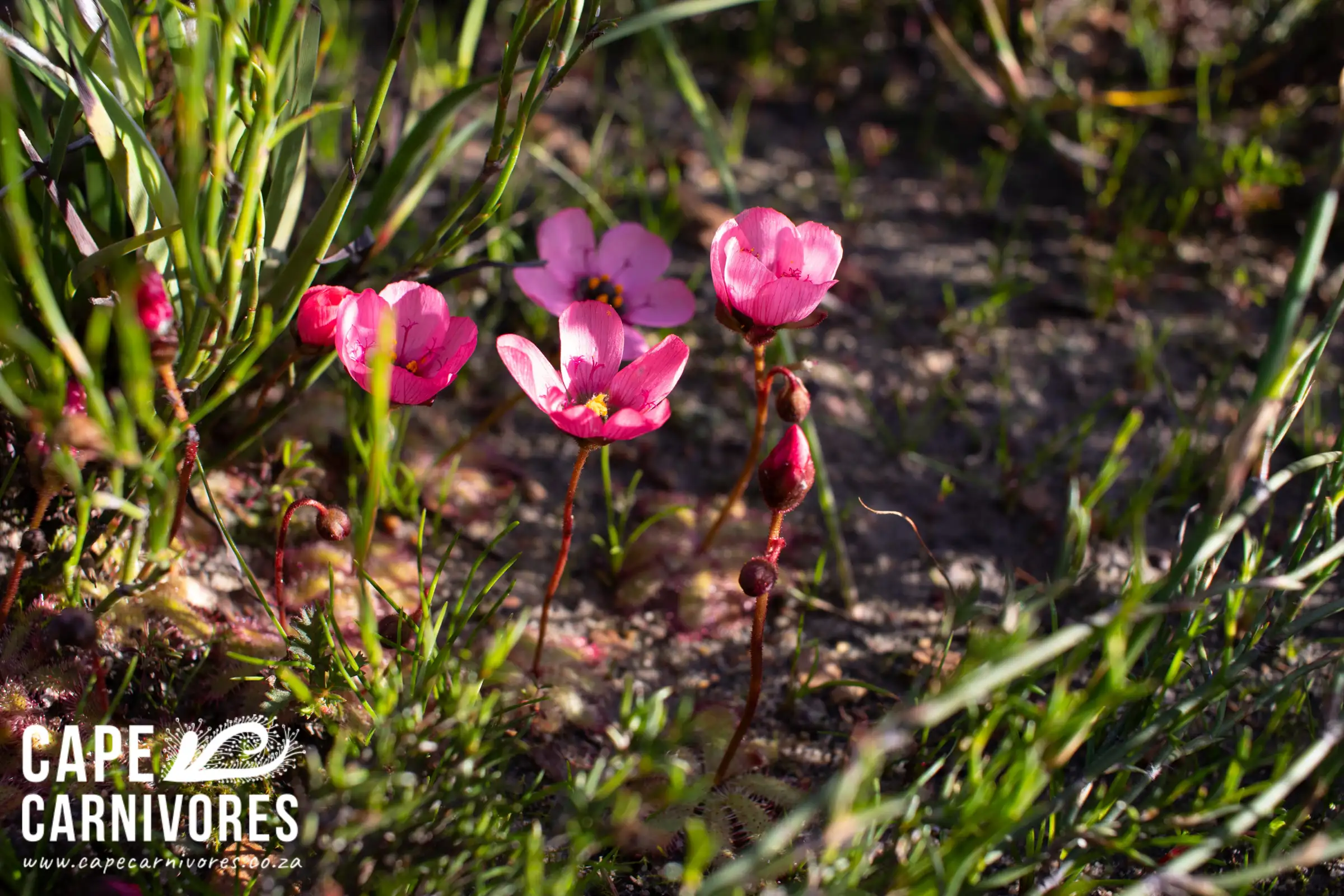 Cape Drosera hybridise somewhat regularly in the wild, producing numerous unusual and unique forms. They tend to occur between species growing nearby one another, unsurprising as many of the sundews have a similar pink flower. Winter grower hybrids also pop up, even across flower colour boundaries.