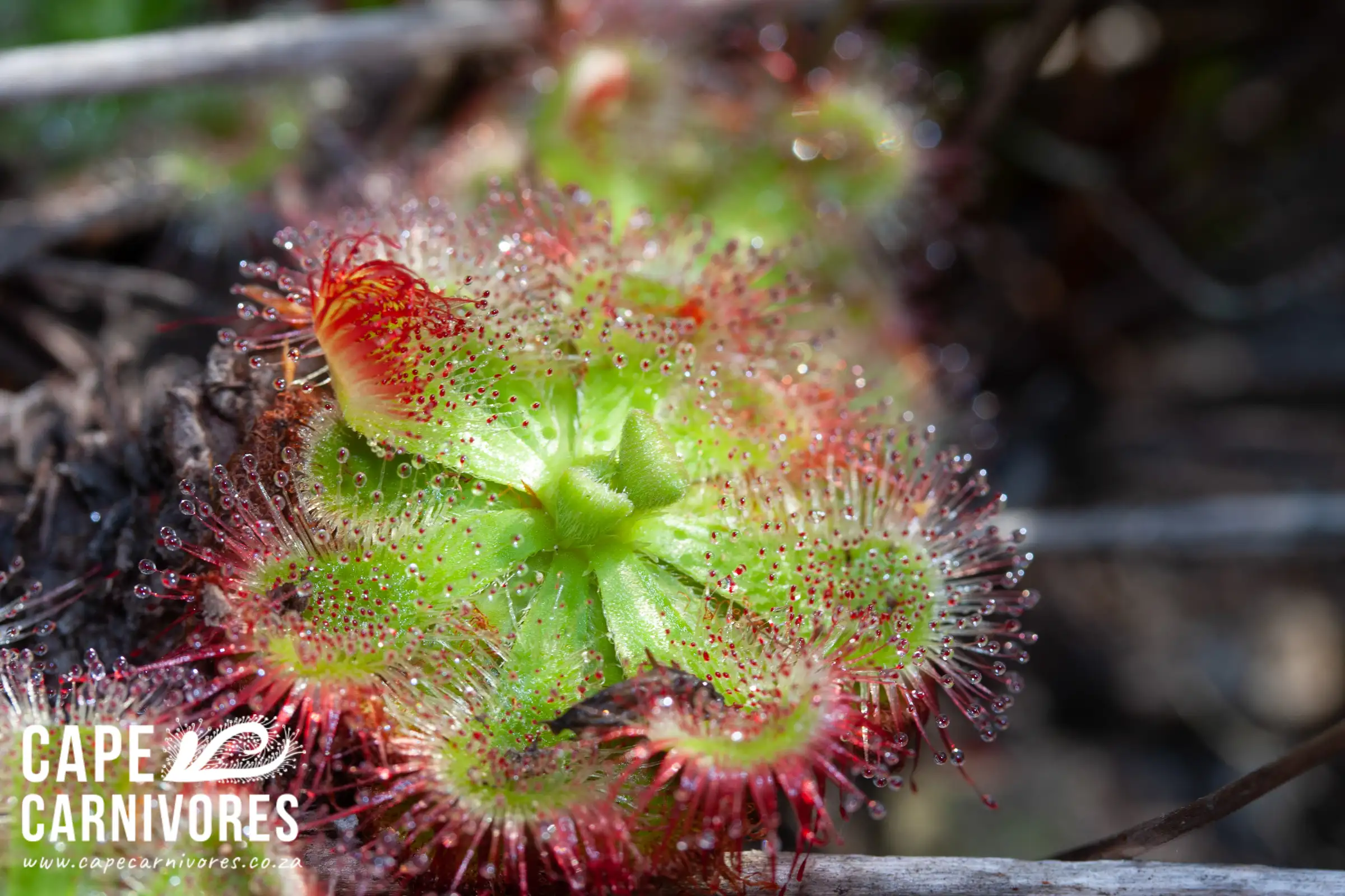Drosera xerophila is a strange species as far as sundews go, neglecting wet bogs and seeps in favour of deep, dry sands. Despite being a common sight in the Kogelberg and Kleinrivier mountains it was only described as a species in 2017, formerly being a subspecies or variety of Drosera aliciae. Like the other dry-growing Fynbos sundews its leaves are a bright yellow-green with red tentacles, this species has a prominent “dent” in the end of the leaf.